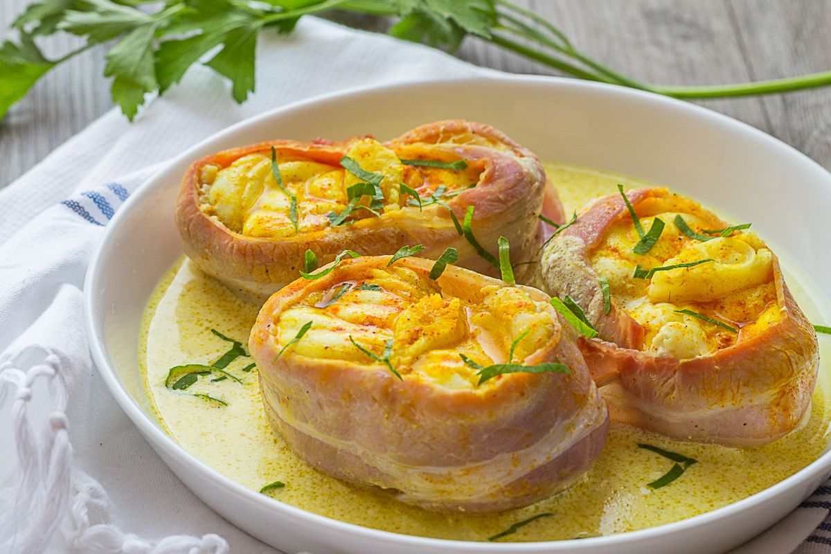 - Enveloppez chaque tronçon de lotte avec une tranche de poitrine fumée et maintenez avec un pic en bois.