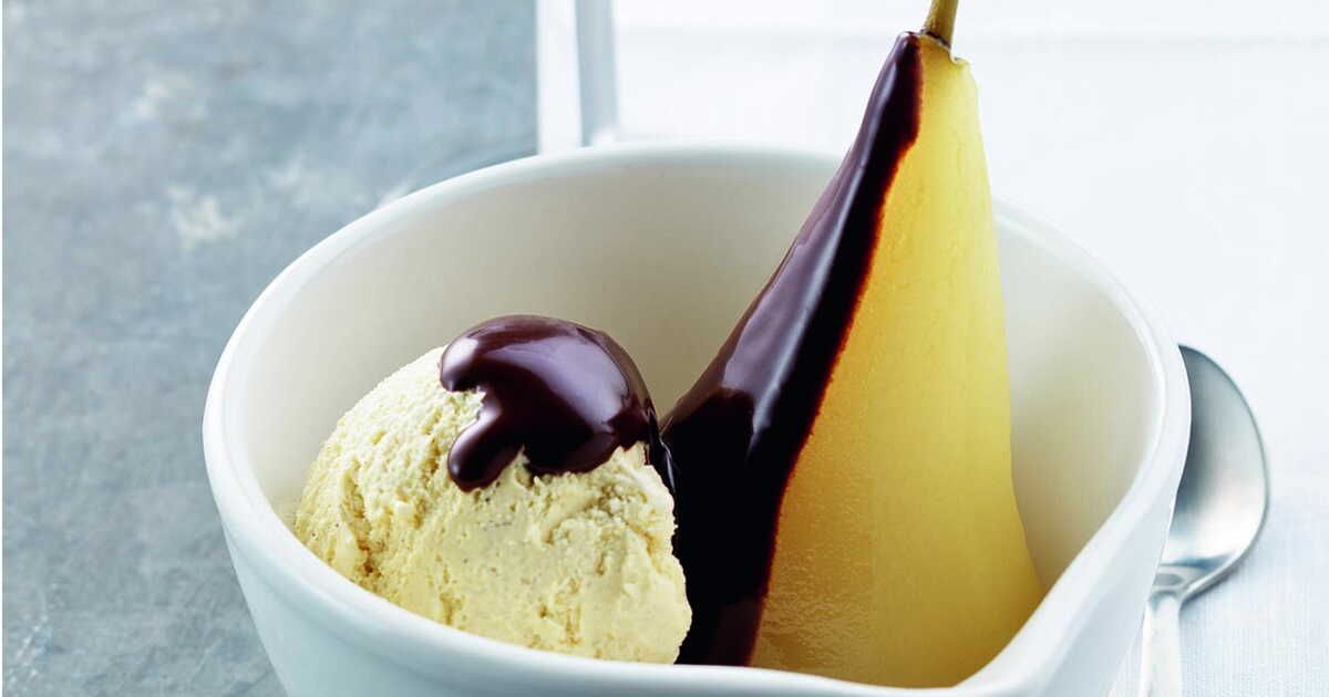 Commencez par pocher les poires dans un sirop léger jusqu'à ce qu'elles soient tendres. Une fois refroidies, servez-les avec une généreuse sauce au chocolat, accompagnées d'une boule de crème glacée à la vanille. Terminez par une touche d’amande pour le croquant.