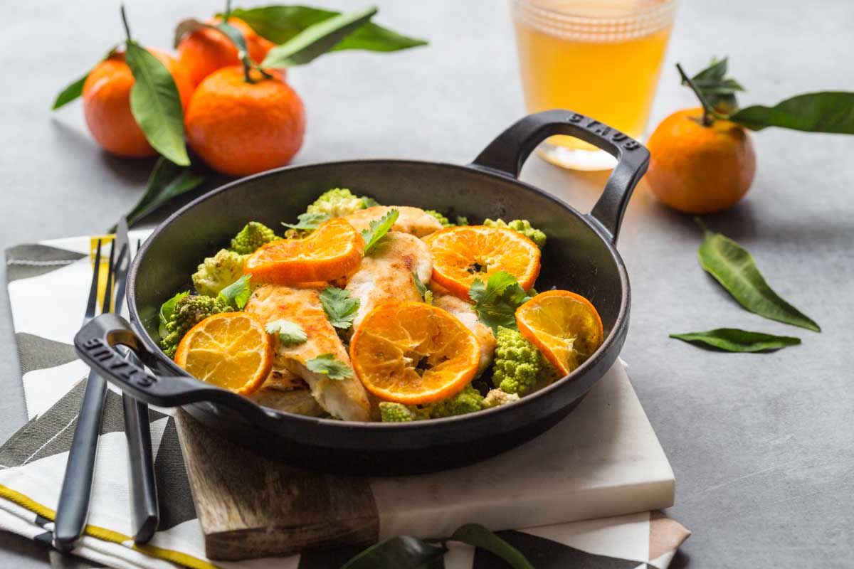 - Remettez le chou romanesco dans la poêle avec les aiguillettes de poulet et les tranches de clémentines. Laissez cuire encore deux minutes, parsemez de coriandre ciselée et servez chaud.